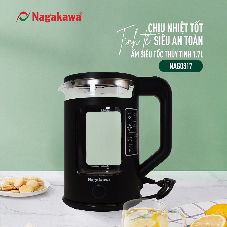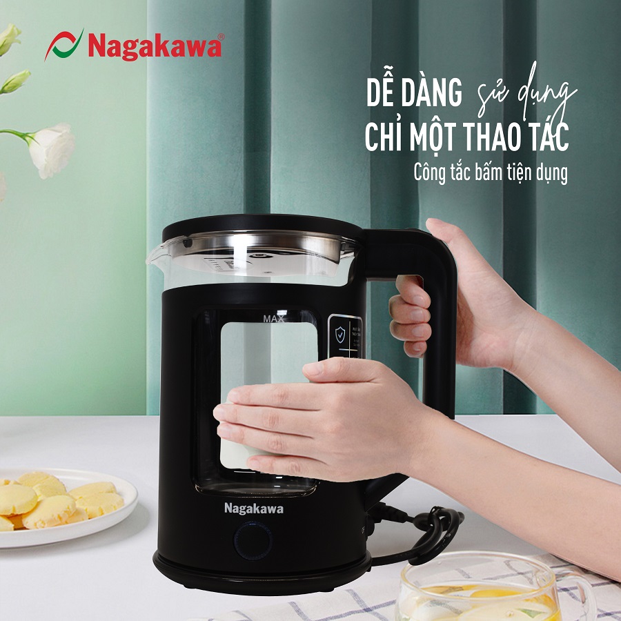 Những chiếc ấm siêu tốc Ấm siêu tốc thủy tinh Nagakawa NAG0317 (1.7L) có thiết kế độc đáo và hiện đại, dễ gây ấn tượng ngay từ ánh nhìn đầu tiên. Thân ấm được cấu tạo 2 lớp là thủy tinh trong suốt và nhựa đen sang trọng. Sản phẩm hứa hẹn trở thành điểm nhấn trong căn bếp của mỗi nhà, đặc biệt là căn bếp hiện đại, trẻ trung.