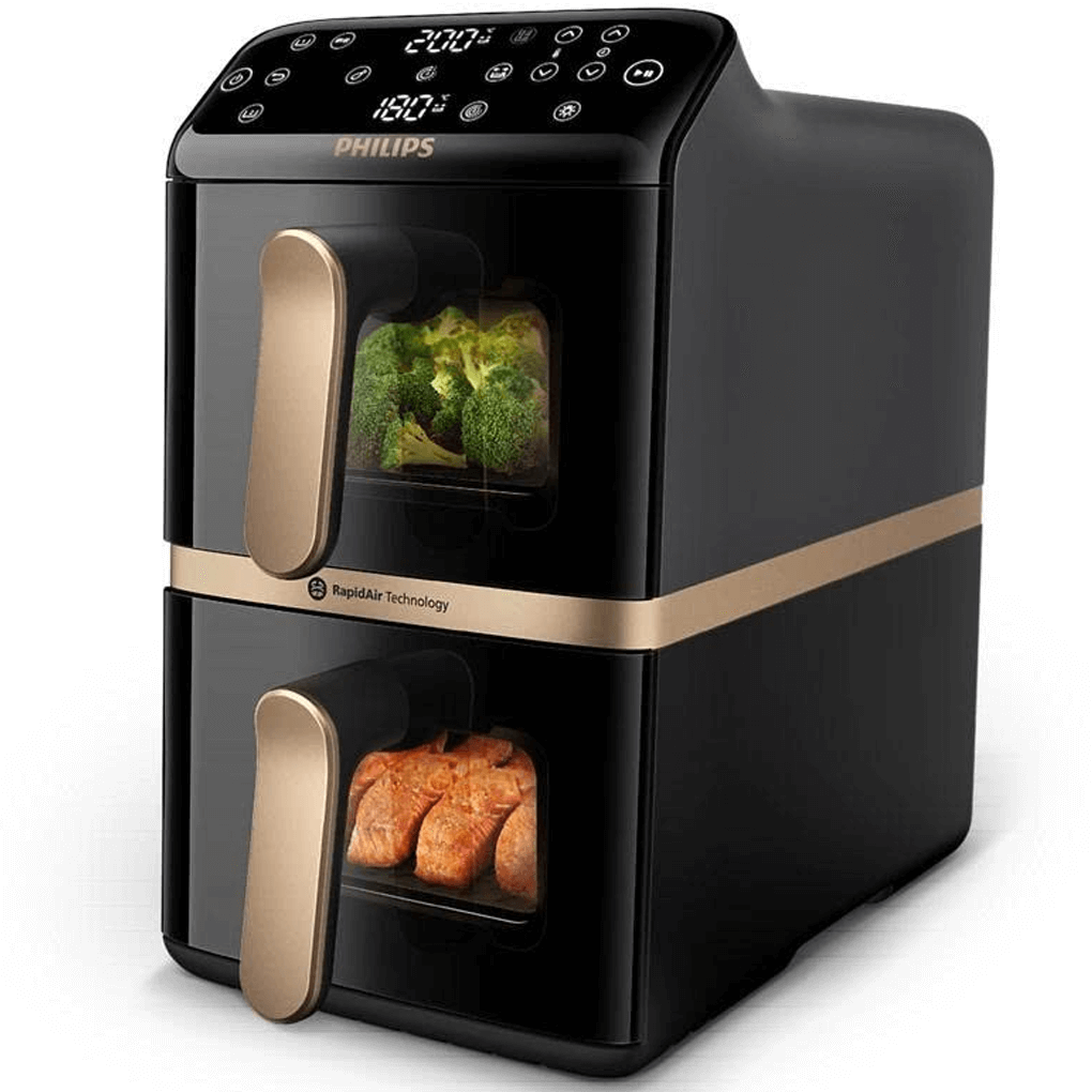 Tổng dung tích của Nồi Chiên Không Dầu Philips NA462/70 lên đến 10 lít (mỗi ngăn có dung tích 5L) cho phép bạn nấu một lượng thực phẩm khổng lồ. Thiết kế xếp tầng không chỉ tối ưu diện tích mà còn giúp phân bổ nhiệt lượng tập trung, đảm bảo hiệu suất nấu nướng tối đa cho cả hai ngăn.