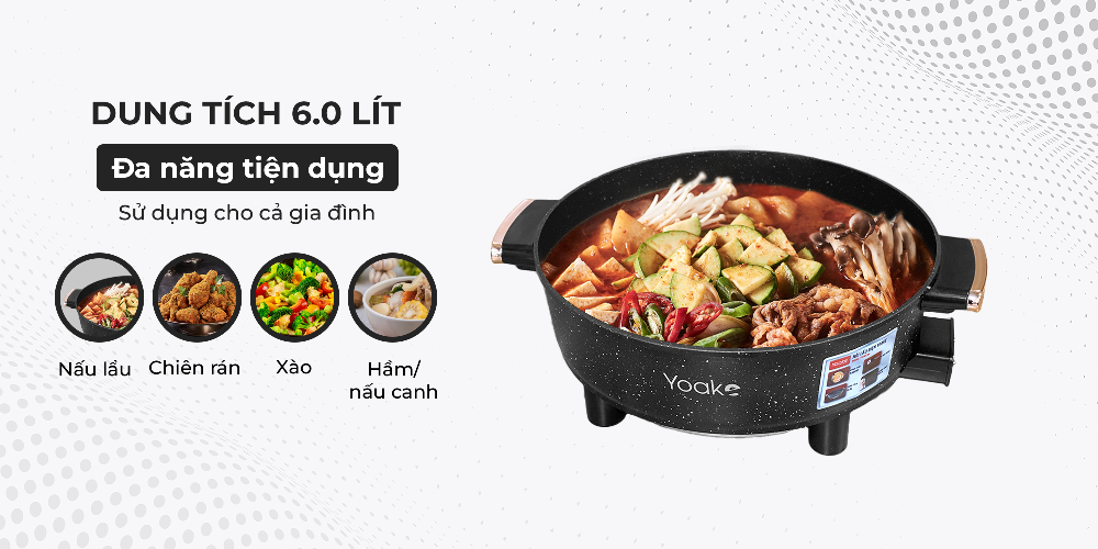 Dung tích nồi lớn 6.0 lít phù hợp cho cả gia đình người trong những buổi liên hoan, họp mặt. Không chỉ nấu lẩu, nhờ lớp phủ chống dính, YK-MT760 còn có thể dùng để xào, rán, hầm… rất tiện dụng, thay thế bếp gas tiện lợi, tiết kiệm năng lượng.