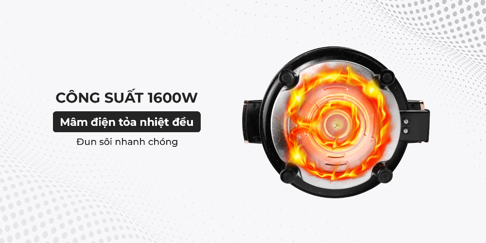Lẩu điện YK-MT760 có một mâm nhiệt lớn giúp truyền nhiệt nhanh và đều, cùng công suất cao 1600W giúp nấu chín thức ăn nhanh chóng, tiết kiệm thời gian nấu nướng.
