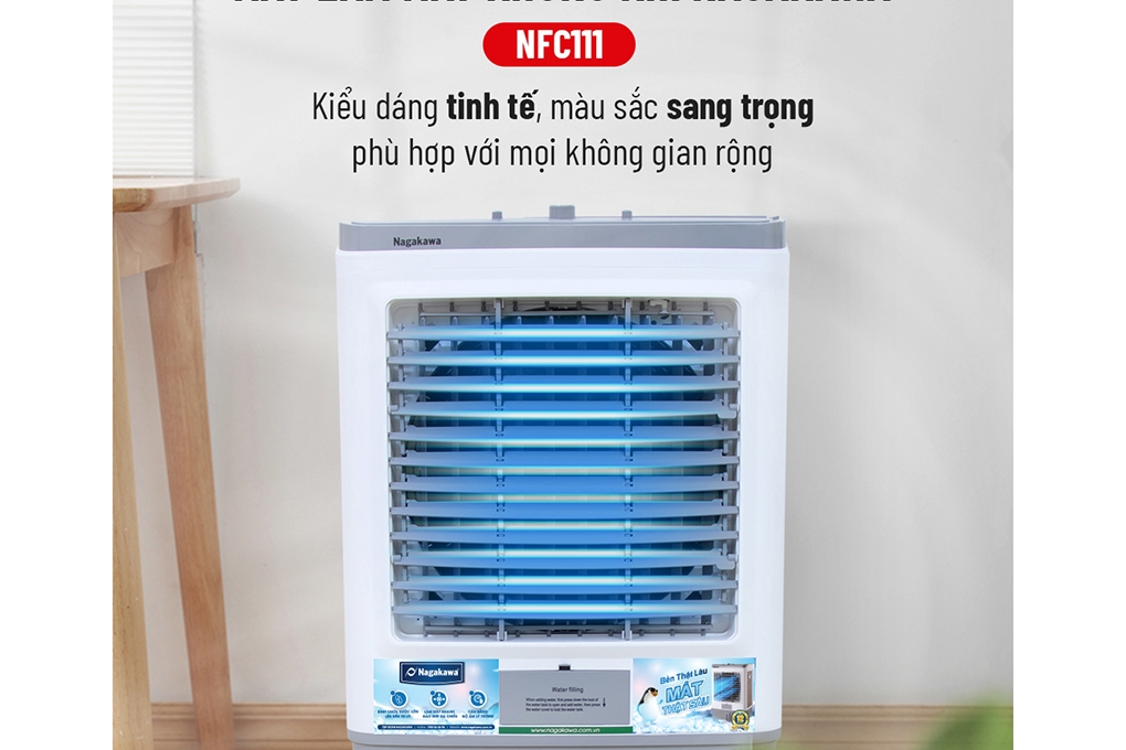 Quạt điều hòa Nagakawa có 3 mặt lấy gió, giúp không khí đươc làm dịu mát nhanh chóng. Ở điều kiện độ ẩm dưới 40%, nhiệt độ trên 42 độ C, phòng rộng thoáng, NFC111 có thể làm giảm tới 15 độ C.