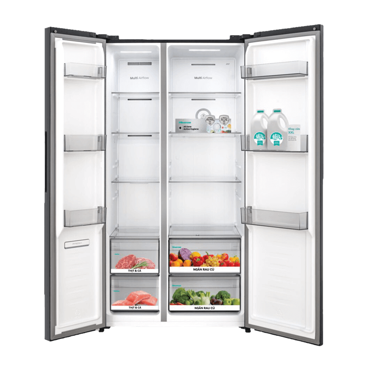 Tủ lạnh Hisense Inverter 550 lít Side By Side RS708N4EBND phù hợp gia đình 4 - 5 người cần tủ dung tích lớn, chia ngăn khoa học, làm lạnh ổn định và tiết kiệm điện. Hệ thống Multi Air Flow, 2 dàn lạnh độc lập, ngăn cân bằng độ ẩm và bộ lọc khử khuẩn, khử mùi giúp bảo quản thực phẩm tươi ngon hơn, trong khi bảng điều khiển ngoài và lấy nước bên ngoài mang lại trải nghiệm sử dụng tiện lợi trong sinh hoạt hằng ngày.